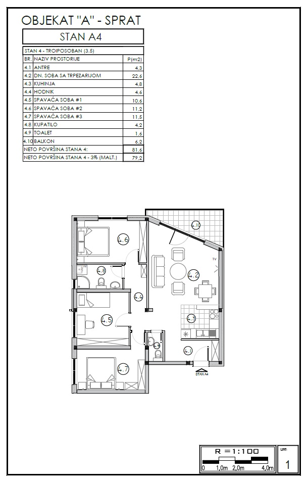 Stan 4 u objektu „A“ je po troiposoban stan (3.5) površine 79,2 m2 sa prostranom dnevnom sobom i velikim trokrilnim portalom sa pogledom na grad. Stan je lociran na I spratu objekta. Stan je podeljen na dnevnu i noću zonu. U okviru dnevne zone su smešteni dnevna soba, kuhinja, trpezarija i toalet dok su u okviru noćne zone smeštene tri sobe i kupatilo. Cena stana je 1.950 €/m2 + PDV.